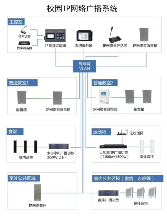 廣播系統(tǒng)設(shè)計(jì)覆蓋學(xué)校的教學(xué)樓、辦公樓、食堂、宿舍、籃球場(chǎng)、校園主干道等區(qū)域;廣播系統(tǒng)按樓層,結(jié)合不同的功能區(qū)域?qū)矎V播系統(tǒng)的使用區(qū)別,進(jìn)行劃分校園廣播分區(qū),本次廣播系統(tǒng)設(shè)計(jì)共5個(gè)廣播分區(qū)和教室獨(dú)立控制,具體點(diǎn)位詳見點(diǎn)位表。